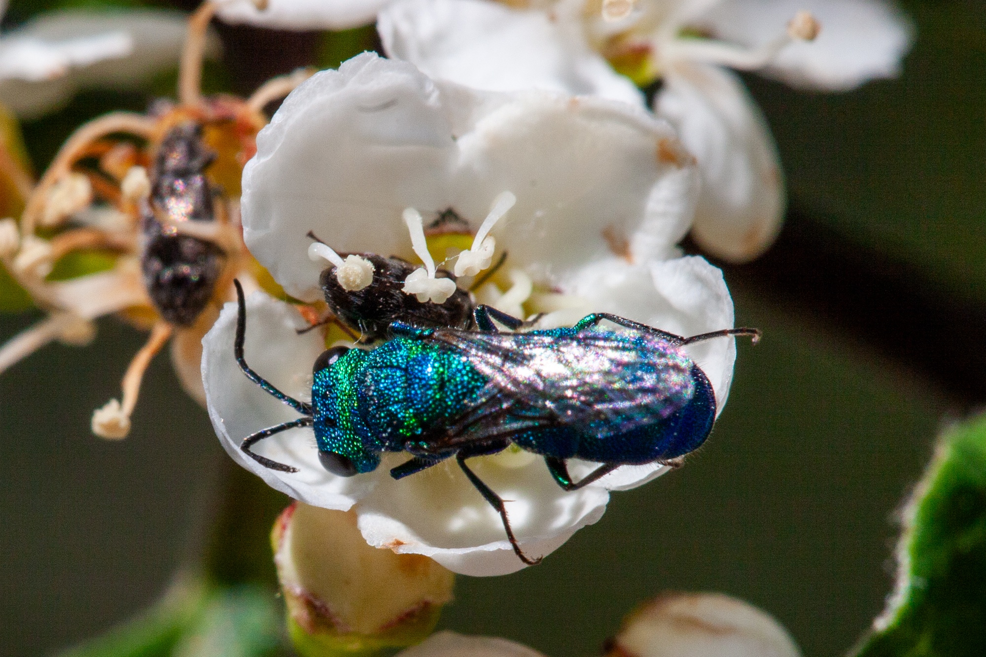 Cuckoo wasps are parasitoids and kleptoparasites, laying their eggs in the nests of other species where their young consume the larvae of their hosts. They have a number of adaptations which have evolved to equip them for their life cycle. They have metallic, armored bodies, and can roll up into balls to protect themselves from harm when infiltrating the nests of their hosts. Unlike most other aculeates, however, cuckoo wasps cannot sting.